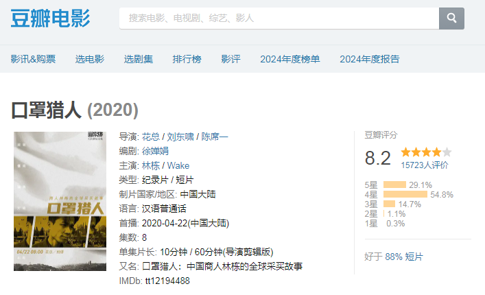 接下来的一年,林栋的名字频繁出现在媒体上,纪录片《口罩猎人》更是让他成了网络红人,豆瓣评分高达8.4分,他被人夸做有胆识、敢赌、会抓机会,但也有人骂他发国难财、是奸商。