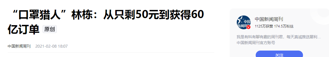 2021-02-08 18:07 中国新闻周刊 “口罩猎人”林栋:从只剩50元到获得60亿订单